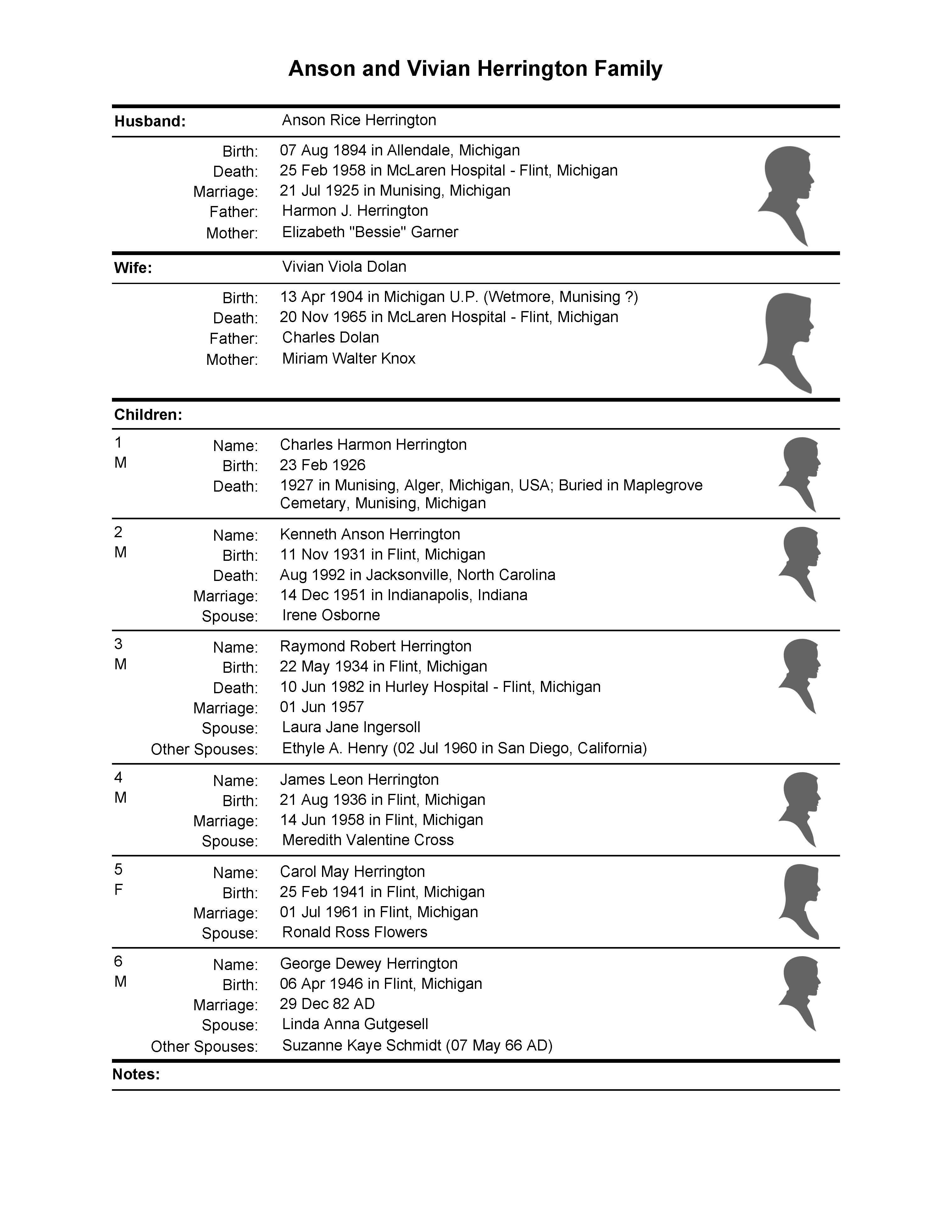 Throughout this website, numerous abbreviated family group sheets have been attached to relevant photographs. The interested observer can use these sheets for a better look at where the individuals fit into the larger family tree. The first of these sheets is below, showing the family of Vivian and Anson Herrington, who of course, are central to everything here.