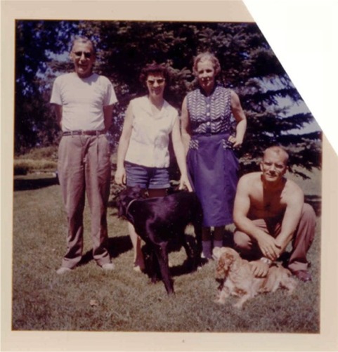 L to R: Bob Earl, Unknown, Margie (Bell) Earl, Unknown Starting from the left is Bob Earl, lady with the black dog is unknown, as is the man with the Cocker Spaniel. Possibly they are children of Bob and Margie who is the lady in the blue dress. She's the daughter of Lizzie Dolan Bell. That would make her Grandpa Charles Dolan's niece . |